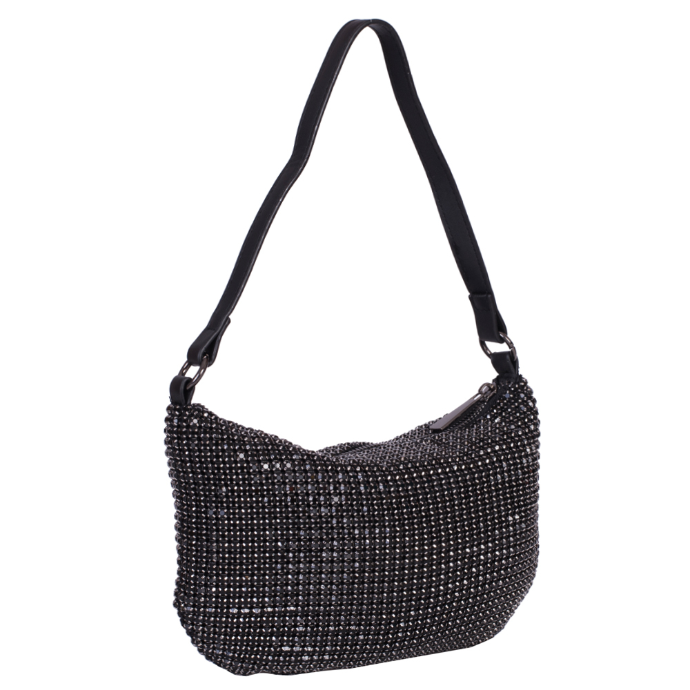 Geanta noastră clutch Beatrice are un corp din plasă cristalină, un mâner din piele și un mâner din lanț argintiu și închidere cu fermoar în partea de sus.