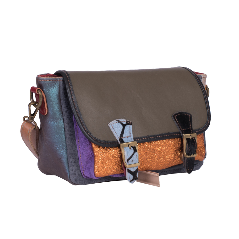 Geanta Aura tip poștaș din piele naturală – Colecția Patchwork - culori și texturi ce transformă fiecare model într-o piesă de artă, este o piesă unicat, creată din piele naturală de calitate superioară, care îmbină frumusețea artizanatului cu funcționalitatea de zi cu zi.